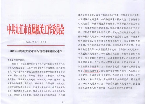 3月28日,2024年度全市机关党的工作会议召开,市直机关工委在会上通报了2023年度机关党建目标管理考核情况,九江银行党委获评“2023年度机关党建工作优秀单位”,这是九江银行连续第六年获此殊荣。
