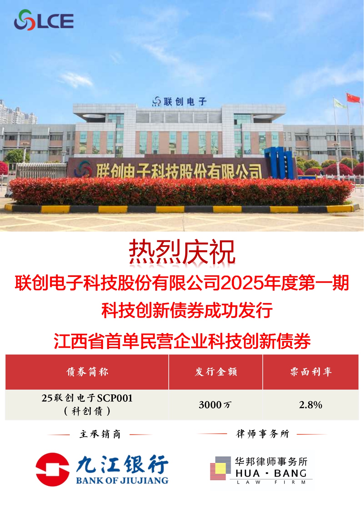 2025年8月29日,九江银行独立主承销的联创电子科技股份有限公司2025年度第一期科技创新债券(简称“25联创电子SCP001”)成功落地。本期科技创新债券发行规模3,000万元,为江西省首单民营企业科技创新债券。