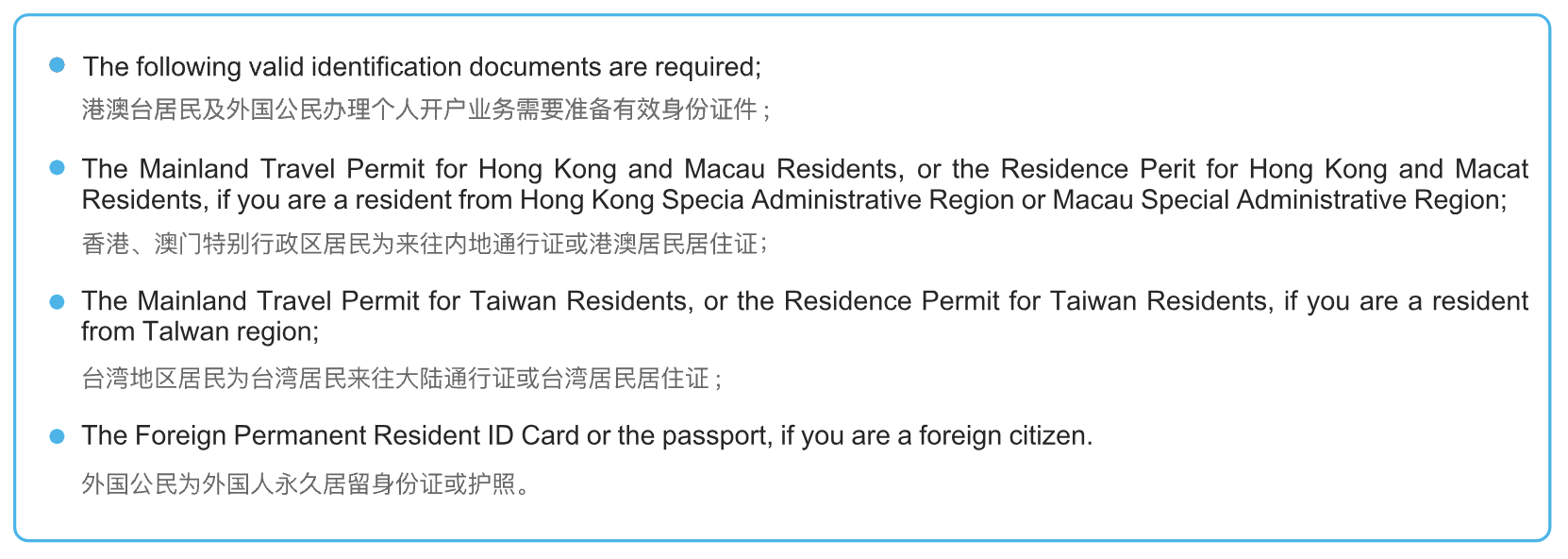 You can open a bank card account at a local bank branch in China with a valid ID. When you apply for a bank card in China, banks are required to conduct due diligence in accordance with international accepted practices, and your cooperation is required.