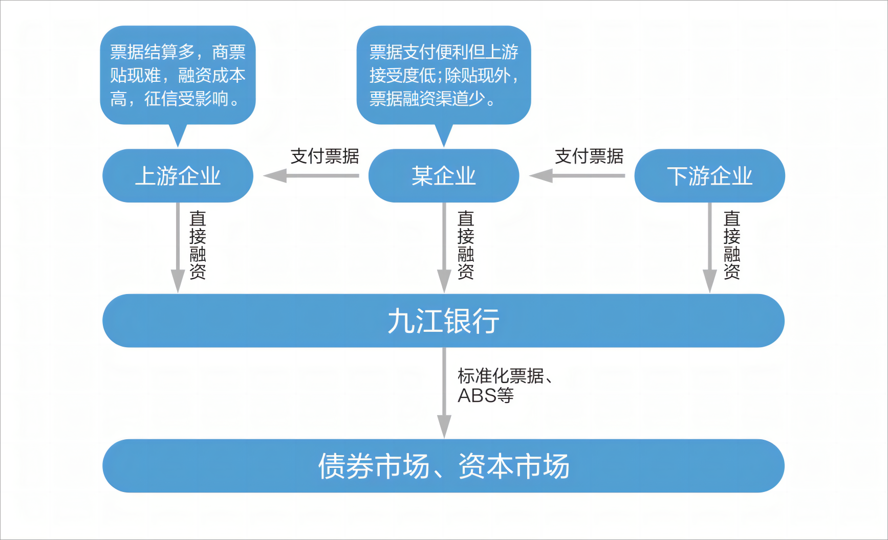 定义:指九江银行为企业客户提供票据直接融资服务,即提供企业应收账款票据化,票据标准化服务。将企业持有的票据打包为标准化票据或ABS等,在金融市场进行直接融资,旨在帮助企业获得更便利和低成本的直接融资渠道。
