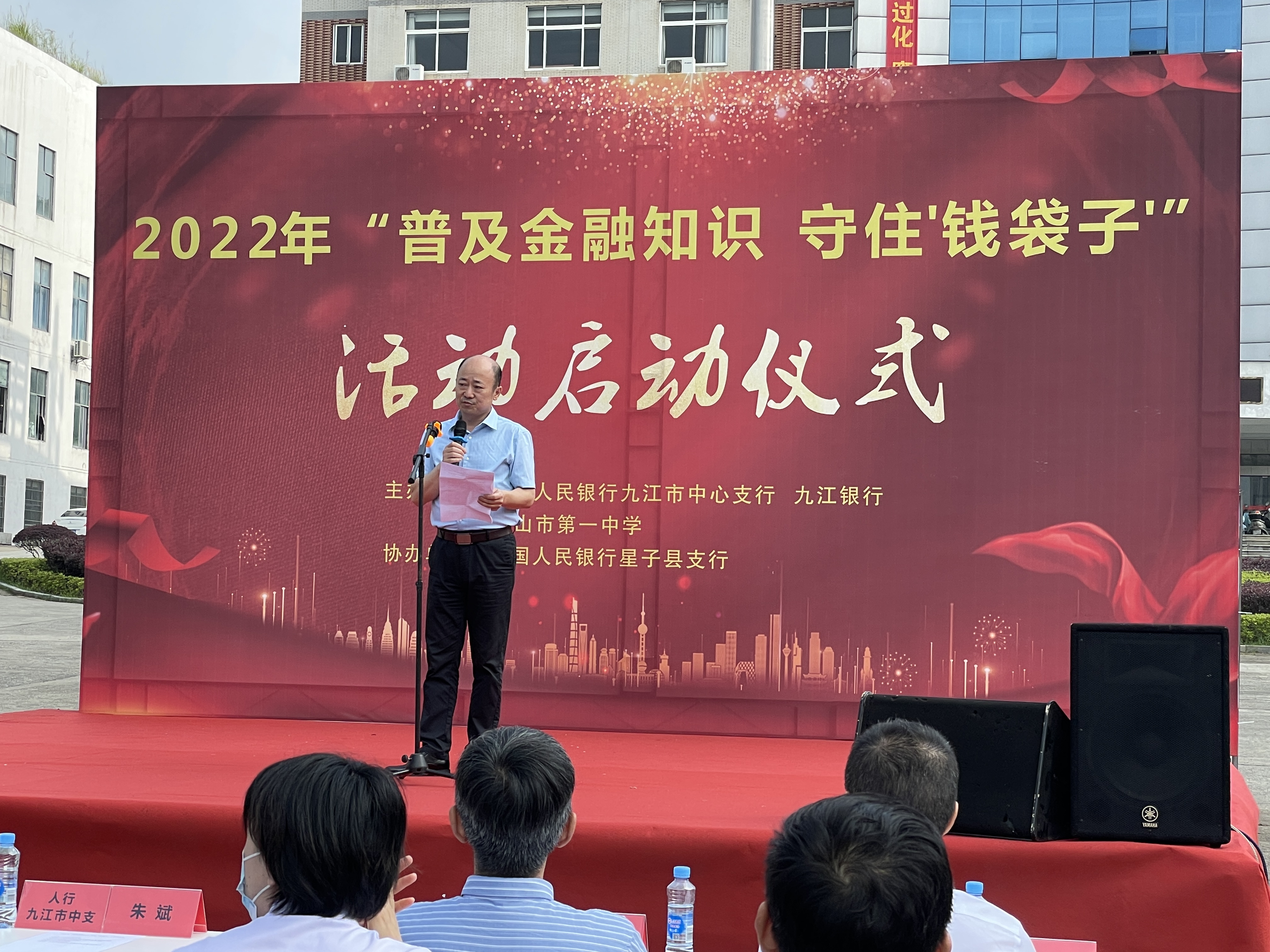 6月14日,由人行九江市中心支行与九江银行共同主办的2022年“普及金融知识,守住‘钱袋子’”活动启动仪式在白鹿洞金融教育示范基地顺利举办。人民银行九江市中心支行副行长朱斌作重要讲话。